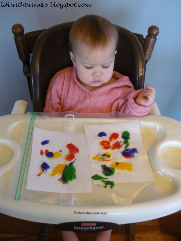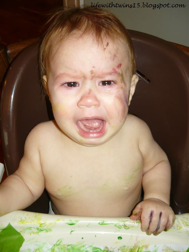 Charlotte immediately began to eat the paint. I guess I confused her because when they are in their high chairs, everything I put on the tray is food... I doubt it tasted very good, and my reaction of grabbing her hand out of her mouth and telling her "No!" probably didn't help the situation. I grabbed some of the wet paper towel (thank goodness I had that easily accessible!), and wiped her face and hands. But she continued to cry, and kept trying to put the paint in her mouth...